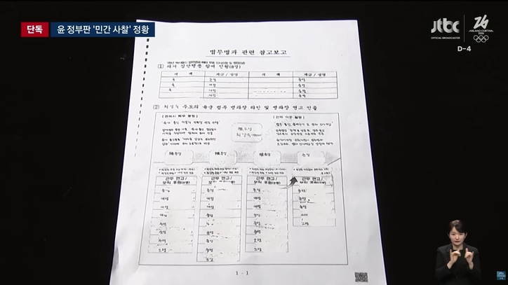 JTBC가 공개한 ‘법무병과 참고 보고’ 문건은 2023년 방첩사 신원보안실이 작성한 것으로 소개됐다. 문건에는 당시 민간인 신분이던 최강욱 전 의원의 군 복무 시기 동향과 전역 이후 행적이 적시돼 있고, 2018년부터 2022년까지 최 전 의원과 ‘모임’을 했다는 군 관계자 30여명의 이름이 손글씨로 정리돼 있다.